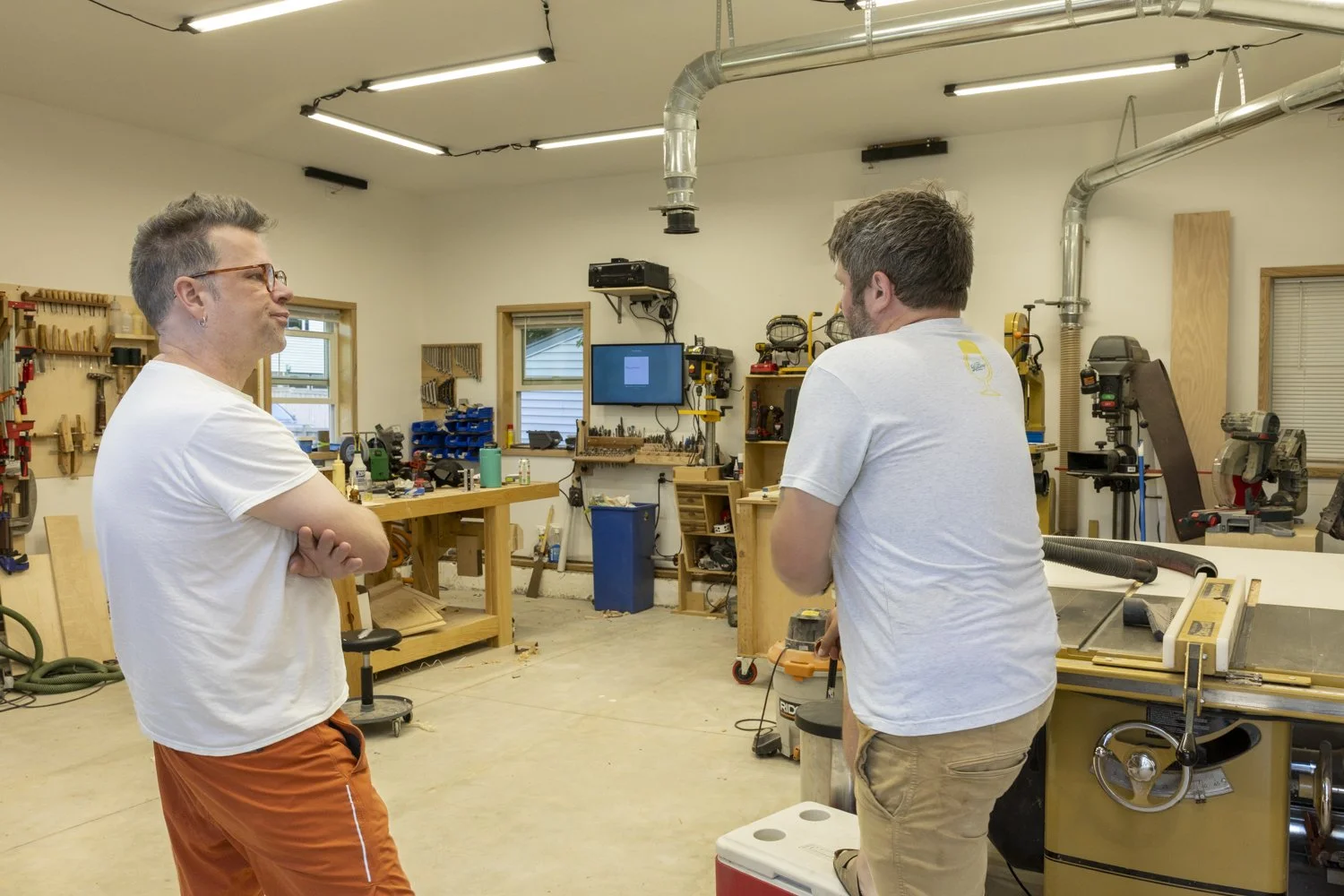 A friend (left) discusses the new woodworking space with Doug (right).
